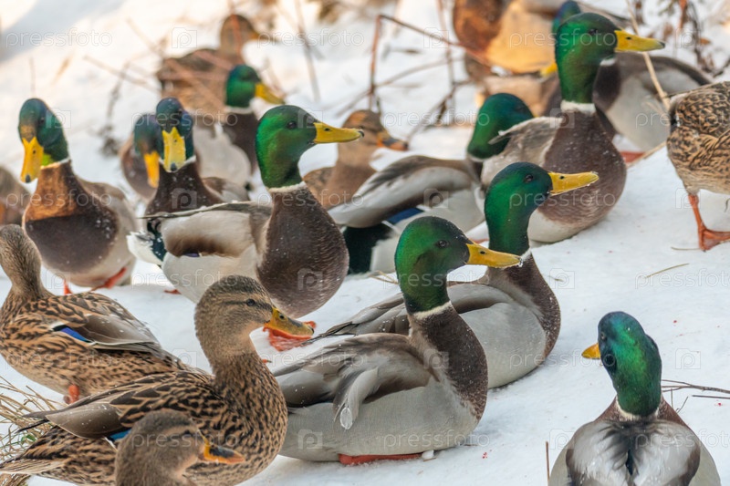 Утки-кряквы на снегу. Портрет дикой утки в зимний сезон