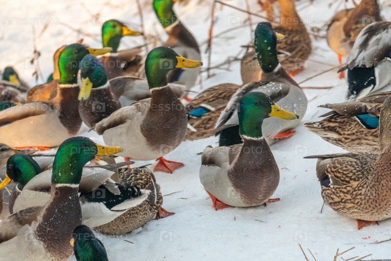 Кряква прячется в снегу. Портрет дикой утки в зимний сезон