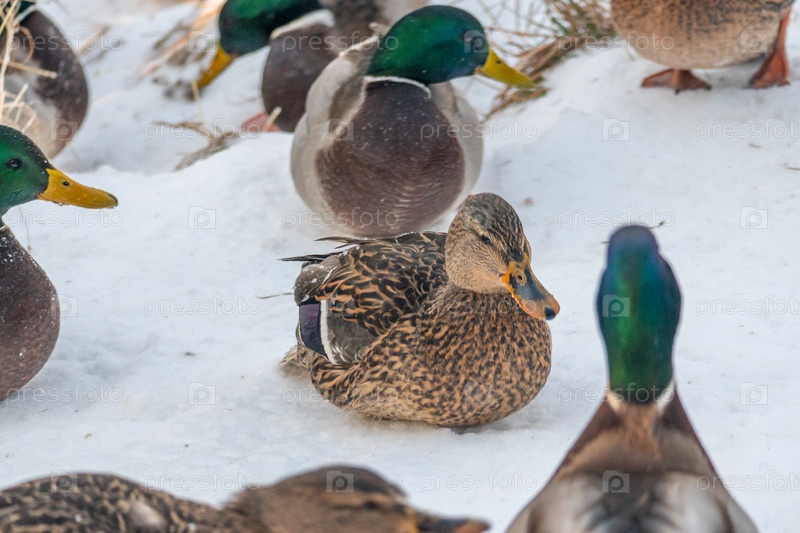 Кряква прячется в снегу. Портрет дикой утки в зимний сезон