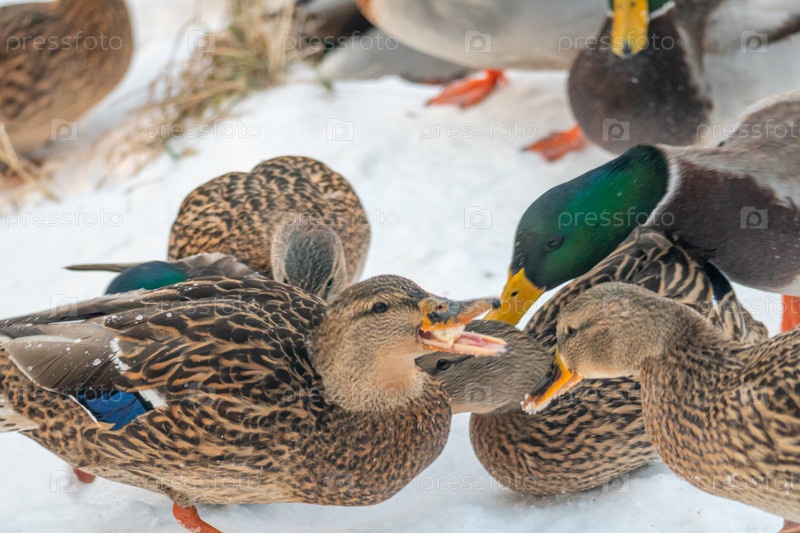 Утки-кряквы на снегу. Портрет дикой утки в зимний сезон