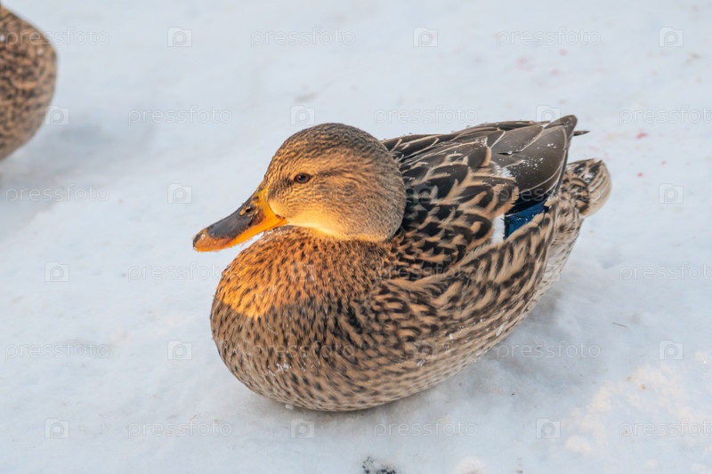 Утки-кряквы на снегу. Портрет дикой утки в зимний сезон