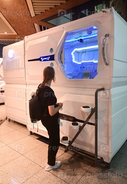 Сочи, Россия - 31 августа 2022 г.: Интерьер футуристического капсульного гостиничного номера в аэропорту