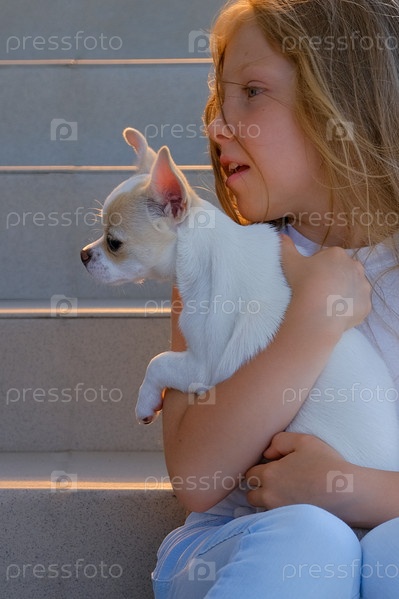 Белый щенок породы чихуахуа на руках маленькой девочки