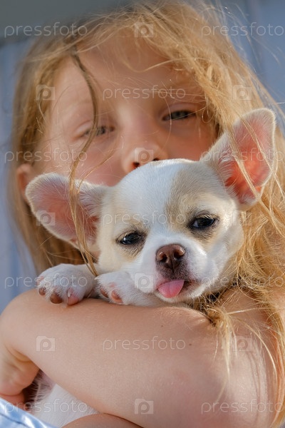 Девочка с маленьким белым щенком чихуахуа