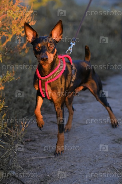 Пинчер на прогулке в солнечный вечер