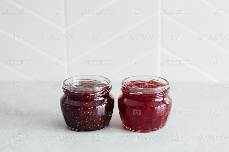 Стеклянные банки с клубничным и малиновым джемом на сером столе у кухонной стены