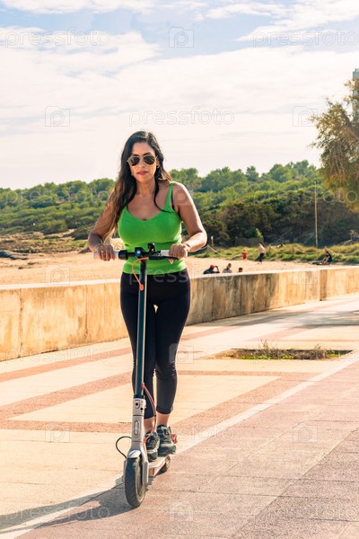 Молодая латинская девушка на электрических скутерах развлекается на городской улице в солнечный летний день. Открытый портрет девушки на электрическом скутере в парке