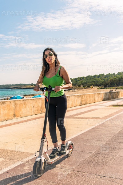 Женщина на электрическом скутере, счастливая и летняя поездка на пляжный курорт тропического острова для отдыха. Городской, уличный и экологически чистый транспорт, развлечения на скутере в отпуске на майорке, балеарские острова,