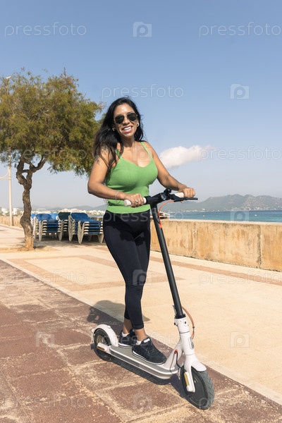 Женщина на электрическом скутере, счастливая и летняя поездка на пляжный курорт тропического острова для отдыха. Городской, уличный и экологически чистый транспорт, развлечения на скутере в отпуске на майорке, балеарские острова,