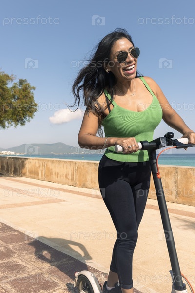 Женщина на электрическом скутере, счастливая и летняя поездка на пляжный курорт тропического острова для отдыха. Городской, уличный и экологически чистый транспорт, развлечения на скутере в отпуске на майорке, балеарские острова,