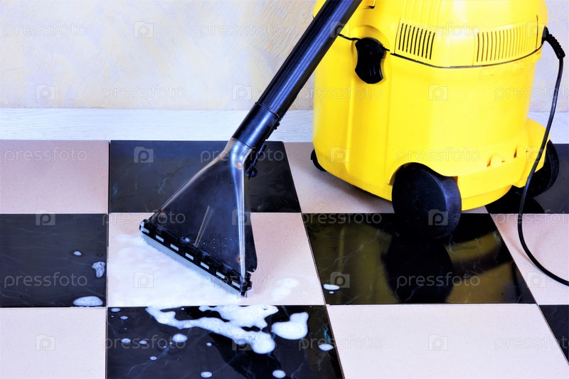 Очистка кафельной поверхности пола пеной с помощью влажного пылесоса, санитарно-восстановительная очистка от мусора. Поддержание безопасной гигиены чистоты, удаление загрязнений в производственных, офисных, бытовых и эстетических целях