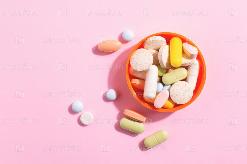 Разнообразные красочные таблетки, добавки и витамины в оранжевой миске на розовом фоне с копией пространства
