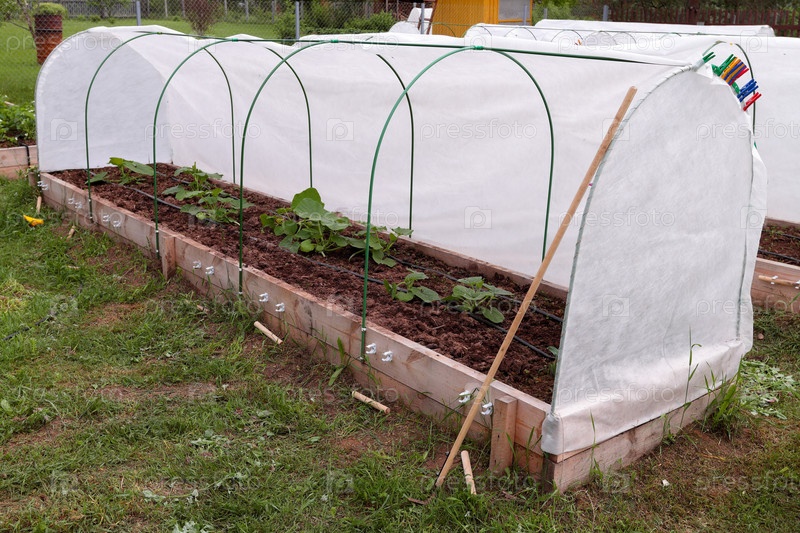 Рассада кабачков в парнике на высокой грядке с капельным поливом и дугами