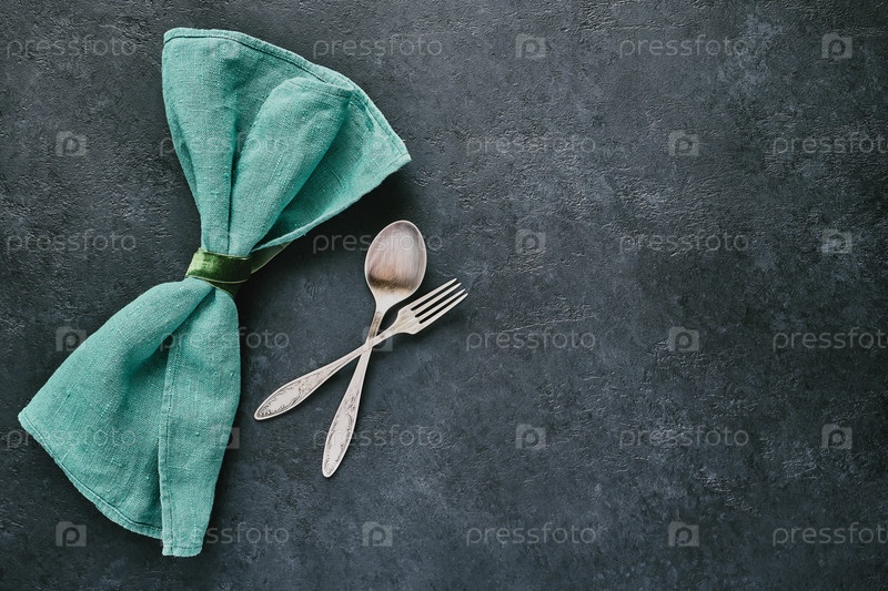 Вилка, ложка и зеленая льняная салфетка на черном сланцевом фоне с копией пространства, столовые приборы, вид сверху