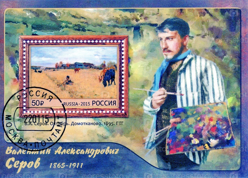 Россия, около 2015: Почтовый блок к 150-летию со дня рождения художника Валентина Александровича Серова. На почтовой марке изображена картина В.А. Серова «Октябрь. Домотканово» (1895), на полях почтового блока - портрет художника