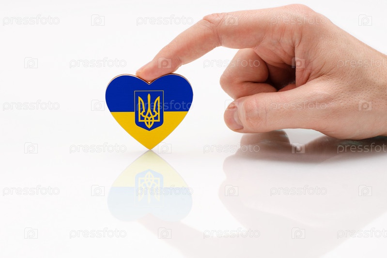 Любите Украину. Флаг Украины с гербом. Мужская рука держит сердце в форме неофициального украинского флага на поверхности белого стекла. Концепция украинского патриотизма и гордости