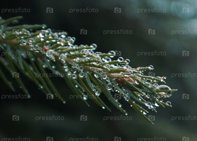 Капли дождя на ветке ели
