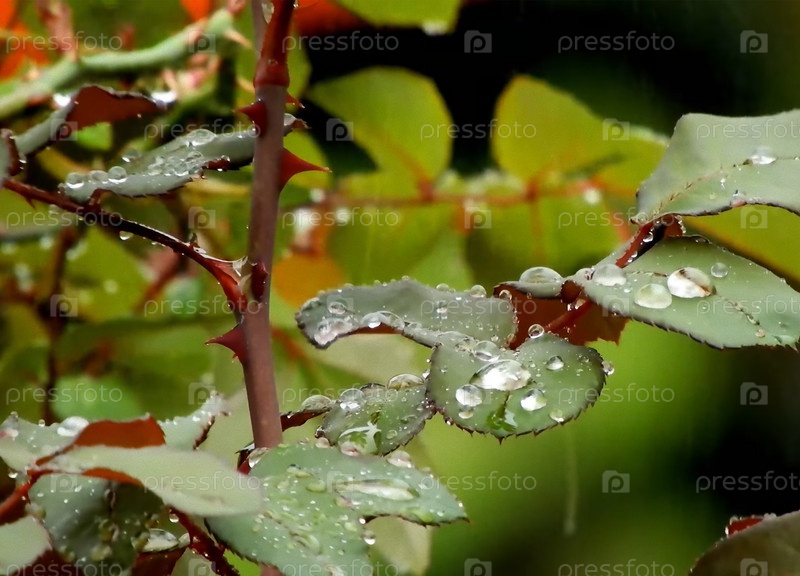 Капли дождя на розовом кусте