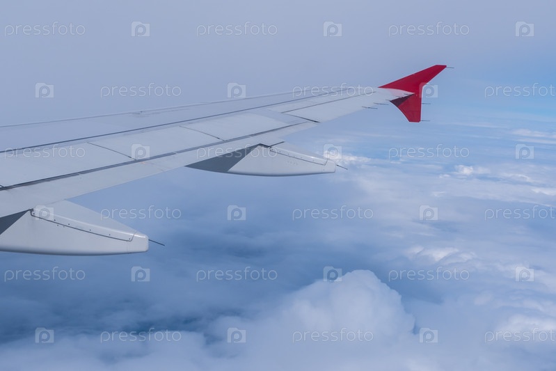 Вид на белые облака и Землю из иллюминатора самолета. Концепция путешествия
