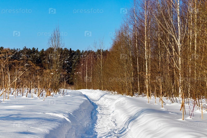 Тропинка в лесу в солнечный зимний день