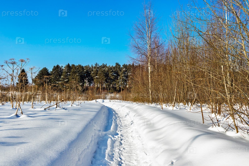 Пейзаж с рощей и дорогой среди сугробов в ясный зимний день