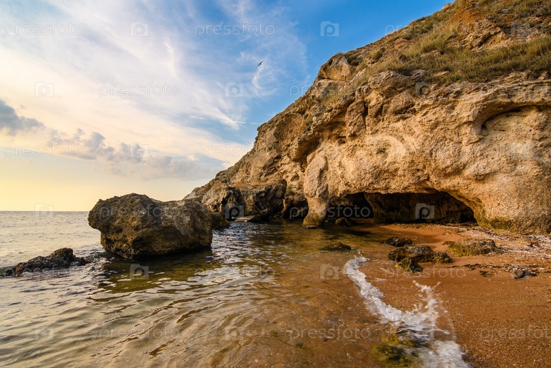 Скалистый берег с небольшими пещерами. Морской пейзаж