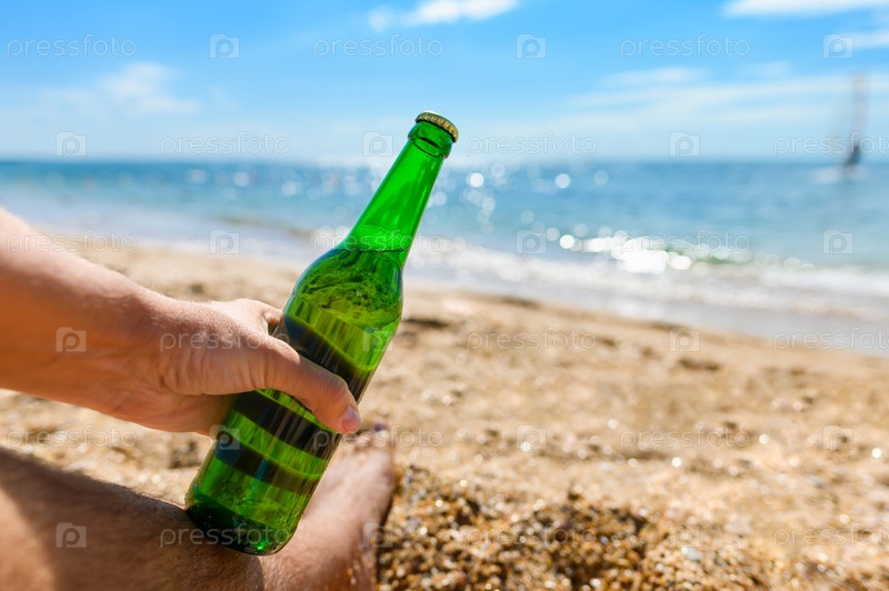 Бутылка пива в мужской руке на пляже. Концепция отдыха на море