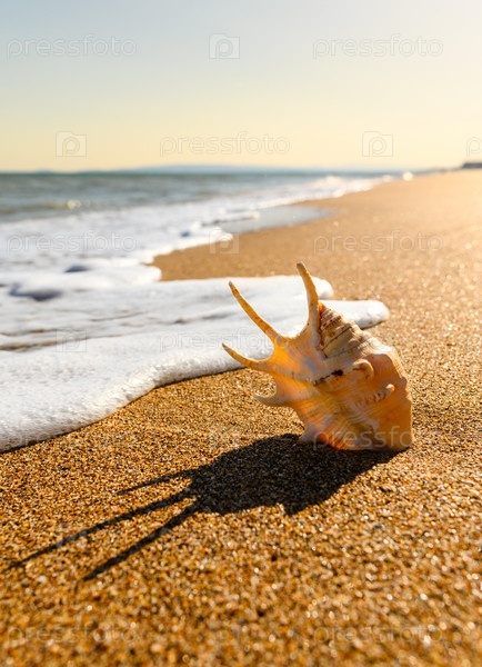 Большая белая ракушка торчит в песке на фоне морских волн и заката. Морской вечерний пейзаж. Вертикальный формат