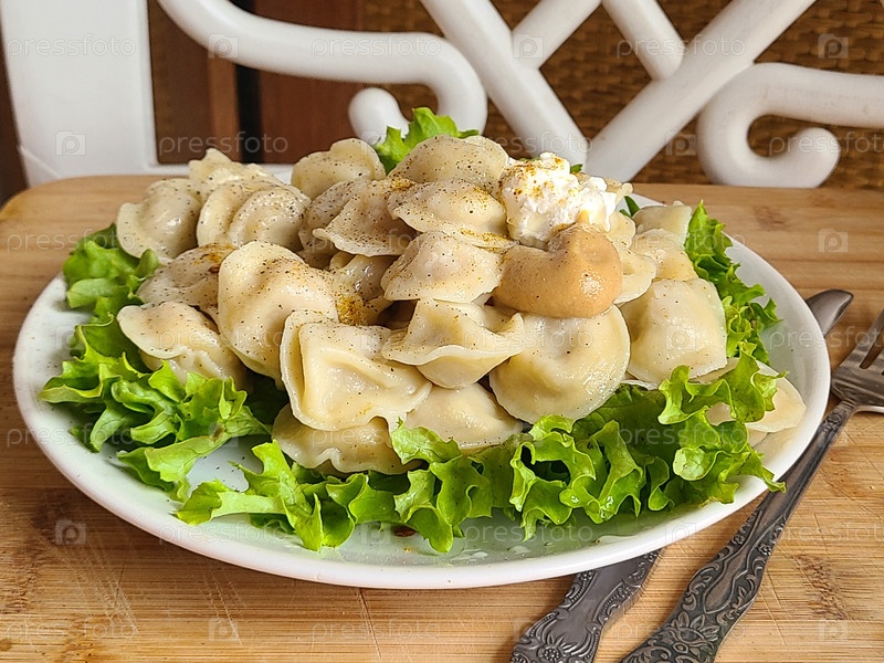 Пельмени со сметаной и горчицей на деревянном фоне