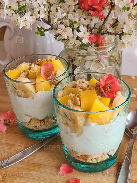 Тропическое парфе из манго и ананаса в каменных банках, сцена на темном деревенском фоне