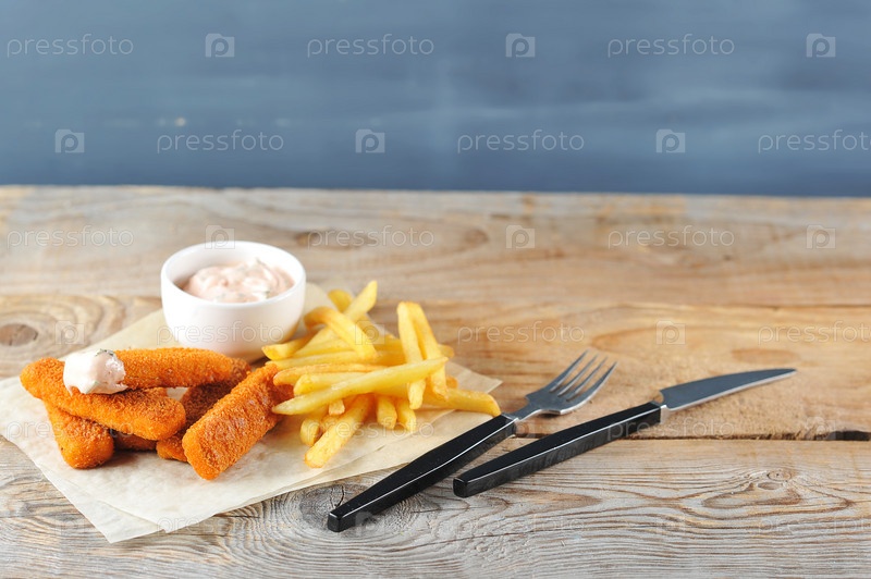 Жареные рыбные палочки с соусом с картофелем фри