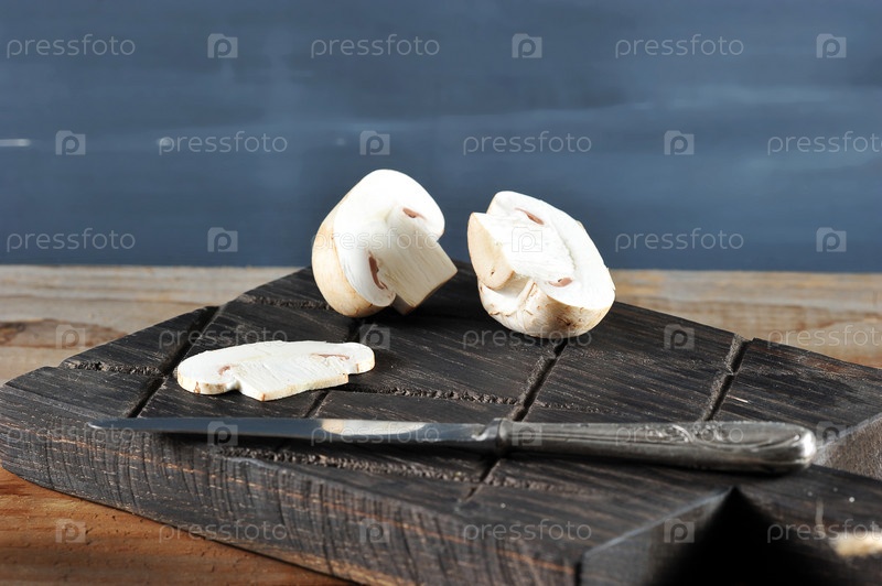 Свежие белые грибы шампиньоны на деревенском деревянном фоне