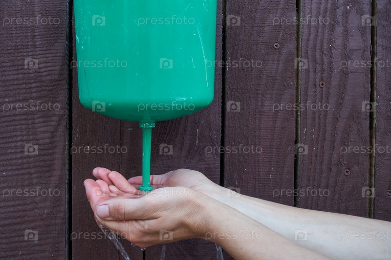 Мужчина моет руки в старой открытой зеленой пластиковой раковине, стоящей на деревянной коричневой стене