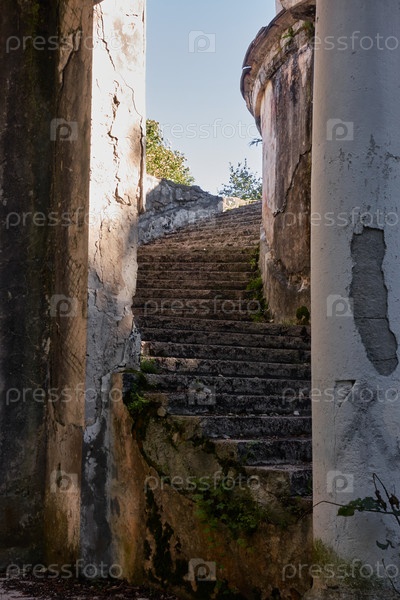 Старая полуразрушенная винтовая лестница с обшарпанными стенами и колоннами, ведущая на крышу заброшенного ресторана