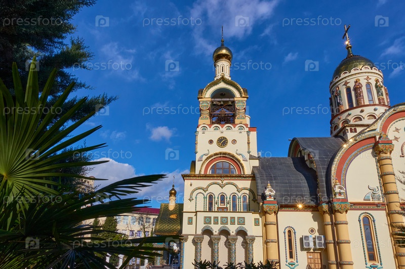 Собор князя Владимира в Сочи в окружении елей и пальм на фоне голубого облачного неба
