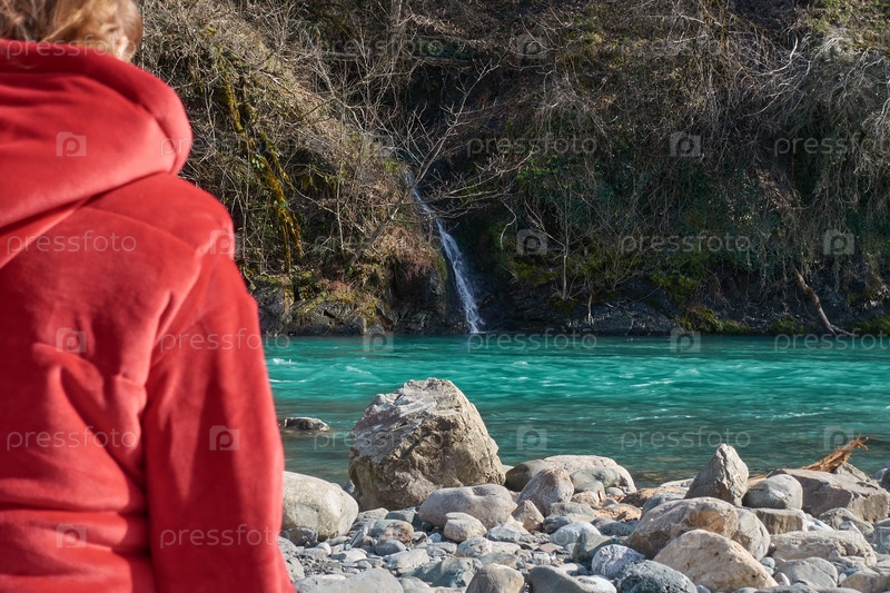 Бабушка в очках стоит на берегу горной бирюзовой реки и смотрит на небольшой водопад, расположенный на другом берегу