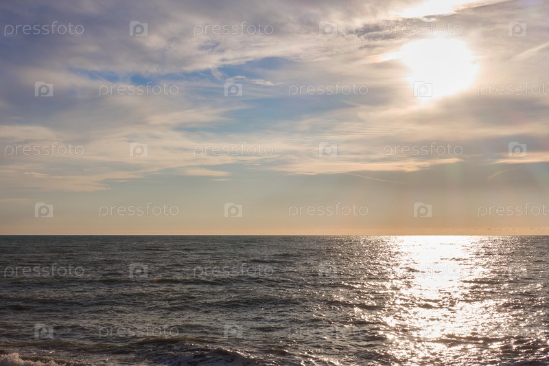 Серое бурное море на закате. В пасмурном небе солнце уходит за горизонт
