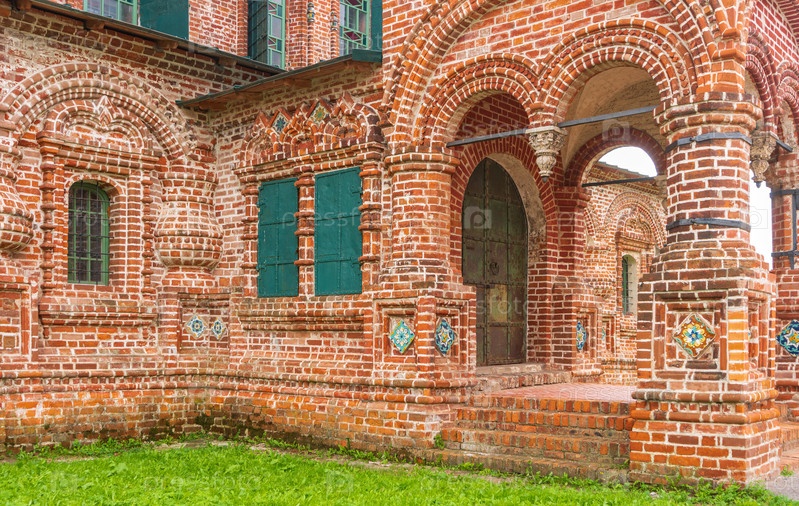 Ярославль, Россия. Фасад церкви Иоанна Златоуста в Коровниках выполнен из красного кирпича с цветными изразцами
