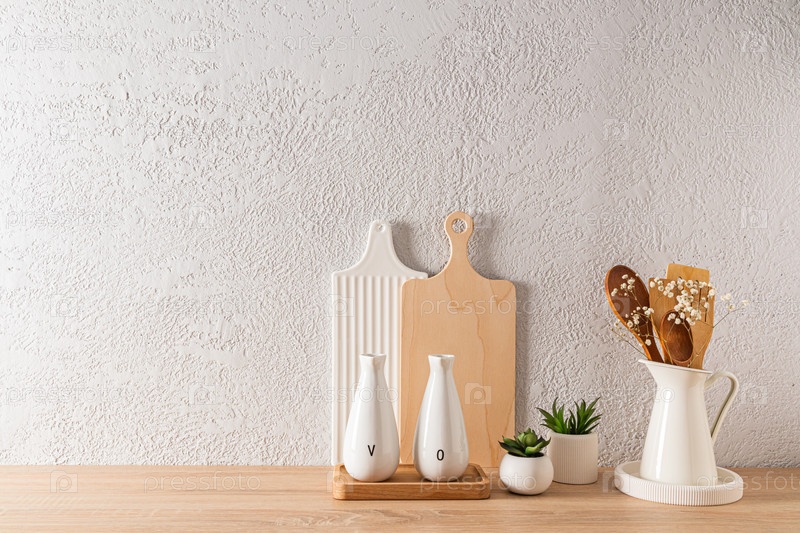 Кухонный фон в минималистской форме с набором разделочных досок и бутылками масла. деревянная столешница. серая бетонная стена. пространство для копирования
