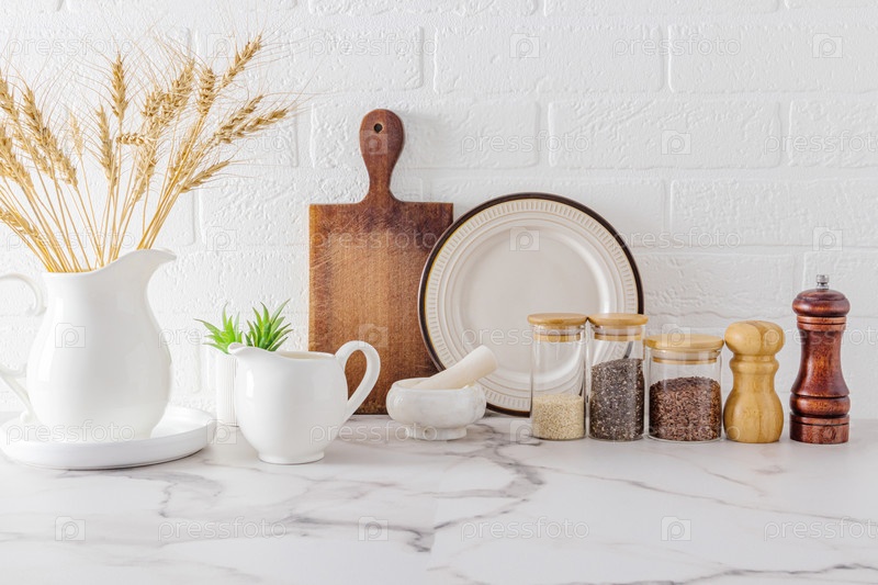 Различные виды кухонной утвари и посуды на мраморной столешнице на фоне белой кирпичной стены. передний план. экологически чистая кухня
