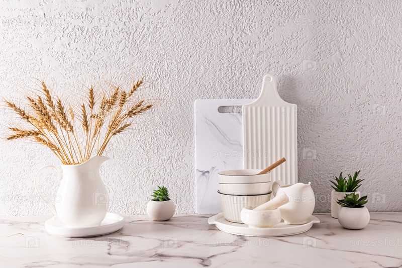 Набор современной белой посуды и разделочных досок на кухне из белого мрамора. минтализм в интерьере кухни