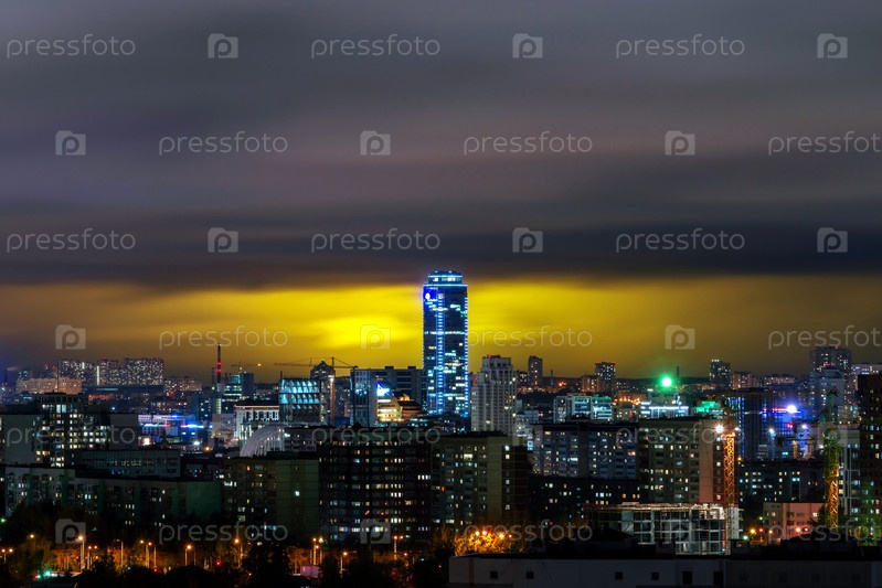 Дом Высоцкого в Екатеринбурге на фоне грозовых туч ночью с подсветкой