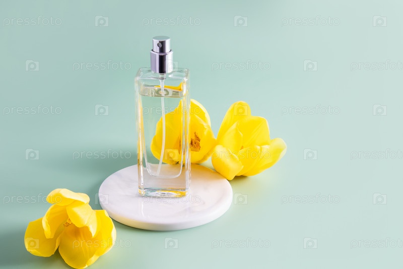 Бутылка женских духов или туалетной воды стоит на мраморном круглом подиуме с желтыми тюльпанами. пастельный фон. пространство для копирования. презентация аромата