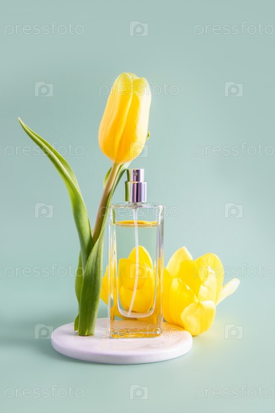 Весенняя композиция с флаконом нежных духов и желтым тюльпаном на белом круглом подиуме. зеленый фон. вертикальный вид