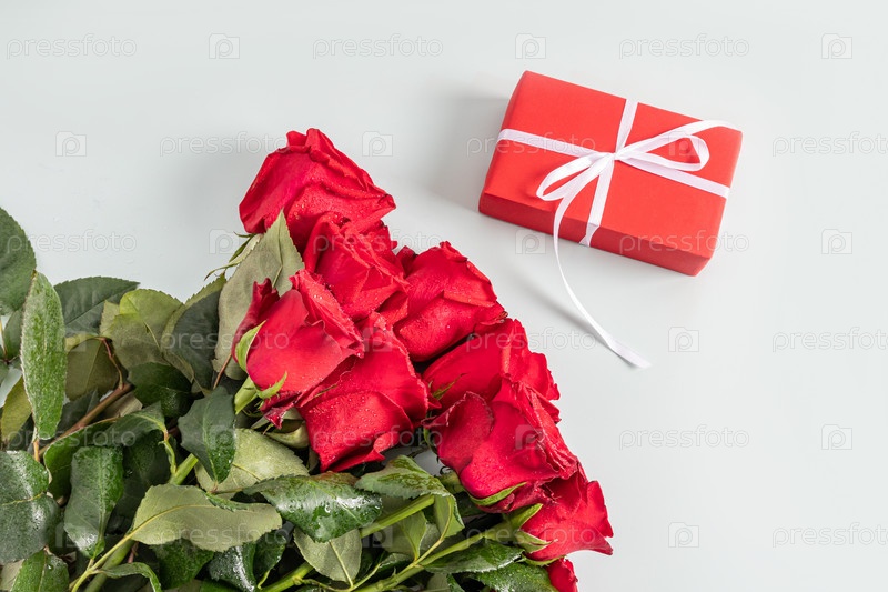 Большой красивый букет красных роз с каплями воды на светлом фоне и праздничная красная коробка с белой лентой. вид сверху. концепция подарка