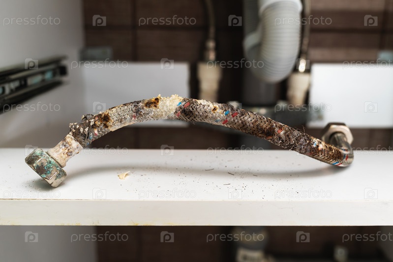 Поврежденный водяной шланг со следами коррозии, деформацией защитного слоя и известковым налетом, концепция на тему своевременной замены водяных шлангов