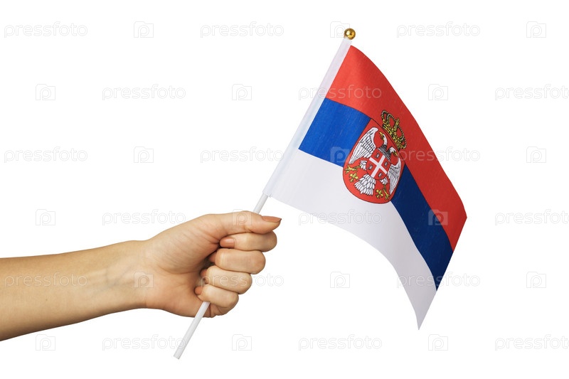Женская рука держит флаг Сербии на белом фоне, шаблон для дизайнеров