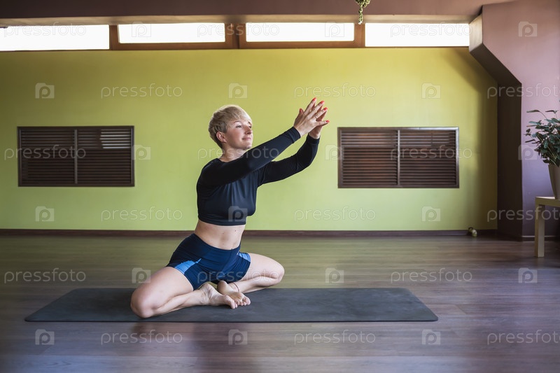 Женщина, практикующая йогу, выполняющая вариацию упражнения Баддха Конасана, поза бабочки, тренируется в спортивной одежде, сидя на коврике в фитнес-студии