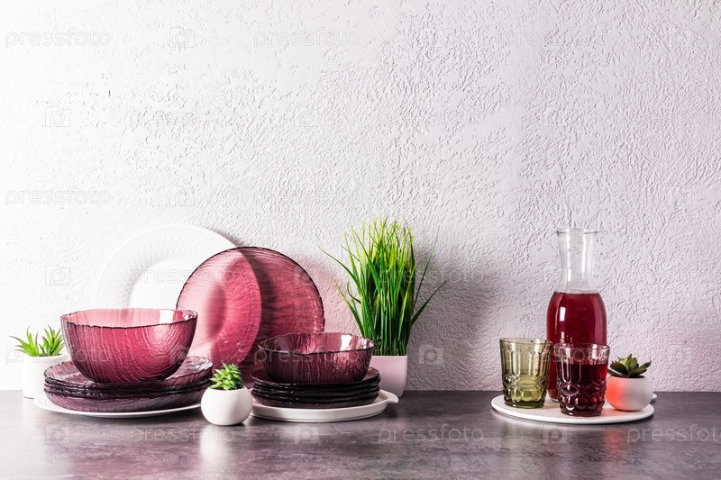 Набор современной стеклянной бордовой посуды и кувшин с виноградным соком на каменной столешнице в интерьере кухни. кухня фон