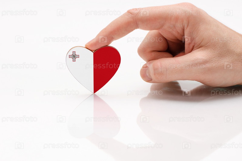 Флаг Мальты. Любите и уважайте Мальту. Мужская рука держит сердце в форме флага Мальты на поверхности белого стекла. Концепция мальтийского патриотизма и гордости